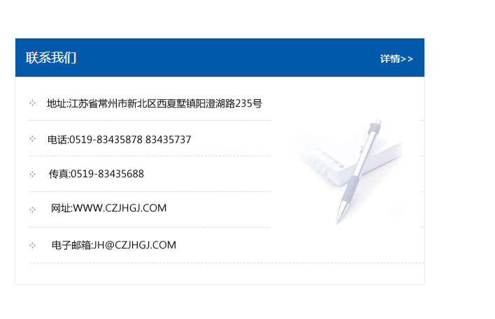 地址:常州市新北區友邦商務大廈1幢16、17層  電話:0519-85101652  傳真:0519-85112595  郵編:213022  網址:www.cz-jiayue_cn.wxtzwl.com  郵箱:xiajifengaa@163.com